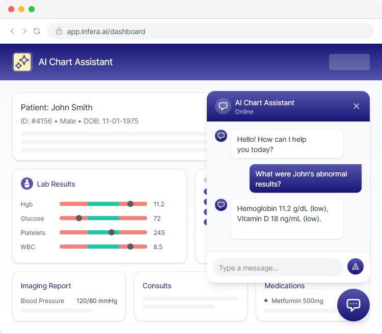 Ask patient-specific questions and receive instant, evidence-informed answers sourced directly from chart data and external documents.