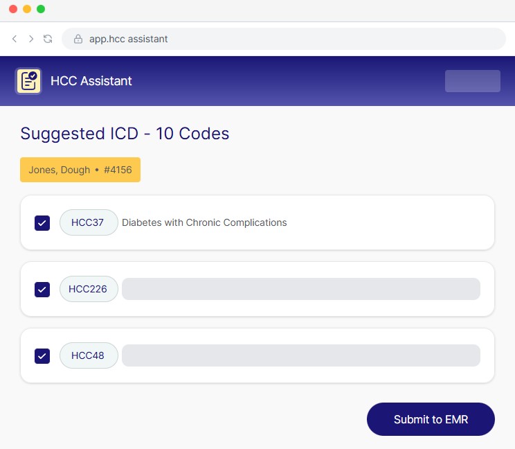 Our NLP analyzes structured notes, unstructured text, and historical data to surface clinically supported HCC codes in real time.