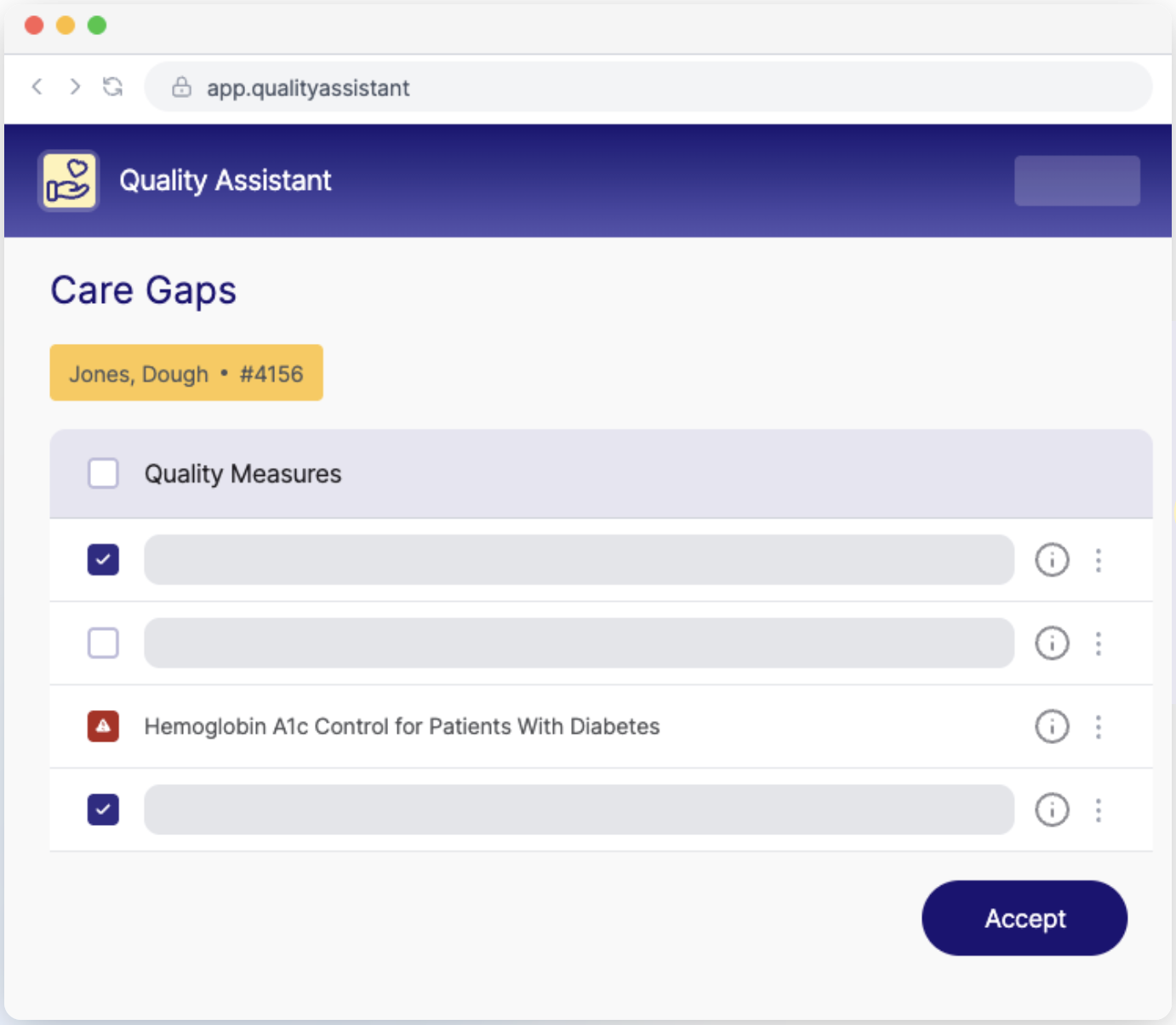 Upload your patient’s list of care gaps and let the Quality Assistant automatically analyze the information.